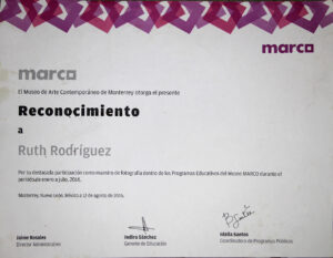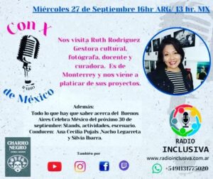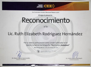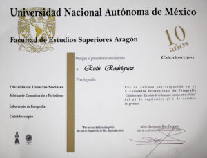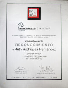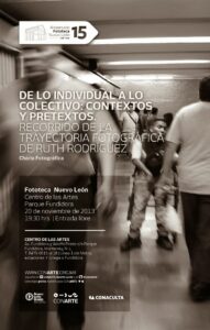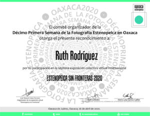 Ruth Rodríguez (México, 1978), es egresada en el año 2000 por la Facultad de Artes Visuales de la Universidad Autónoma de Nuevo León. Ha participado en diversos cursos, seminarios, talleres y encuentros de arte, diseño gráfico, filosofía, literatura y sociología. Con su obra propia ha expuesto de manera colectiva e individual en distintos espacios culturales de México, Argentina, Colombia, Estados Unidos, Portugal, Italia, Cuba y España. Obtuvo el premio de Adquisición en el Salón de la Fotografía de Nuevo León, México, Edición 2003. Forma parte de la exposición Mujeres detrás de la lente: 100 años de creación fotográfica en México 1910 – 2010 del Centro Cultural de Tijuana. Recibió el Reconocimiento a la Excelencia en el Desarrollo Profesional por la Universidad Autónoma de Nuevo León, Generación 2010. Gestora por seis años de la Muestra Internacional e Itinerante de Fotografía Estenopeica con más de 300 participantes de 25 países; coorganizadora de la exposición colectiva de Autorretrato Soy Mujer en Nuevo León, México, con 80 participantes en el 2022; ex miembro fundador de Fotógrafas de México; participante en el Comité de Organización para el Encuentro de Fotografía 2022 en Nuevo León, México; miembro activo del gremio de fotografía en el Consejo para la Cultura y las Artes de Nuevo León en representación de la comunidad; finalista en Enfoque Conecta 2022 Colombia, Plataforma y Red de Internacionalización para la Fotografía Latinoamericana. Finalista como representante de México en E•CO/22, Deconstruir la Mirada, Proyecto Latinoamérica, Vist Projects, AECID y National Geographic. Actualmente, gestiona también la itinerancia de la exposición fotográfica de autorretrato Soy Mujer Latinoamericana formulada para conmemorar el día de la mujer con 35 participantes de 6 países. Realiza gestión, difusión y curaduría de exposiciones, así como proyectos independientes y no lucrativos para promover el arte y la cultura, además de su desarrollo como docente en museos, universidades, colegios, instituciones y de manera independiente. Contribuye en la promoción de los artistas de su ciudad y de otros países con charlas, mesas de diálogo, entrevistas, conferencias y talleres. Reside entre Buenos Aires, Argentina y Monterrey, Nuevo León, México, donde busca establecer lazos para el activismo cultural.